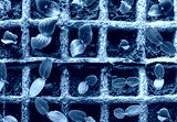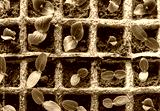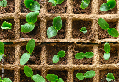 Seedling sprouts of cucumbers and zucchini in the peat pots cassette.