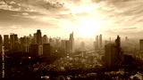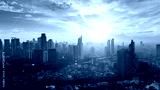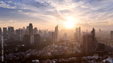 Drone view of misty skyscraper in Jakarta city