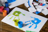Prints of children's hands, painted in the colors of the Ukrainian flag, yellow and blue. National symbol of freedom and independence. Stop the war in Ukraine. 2022