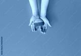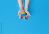 Children's hands hold a stone painted in the colors of the Ukrainian flag. Conflict between the US, NATO and Russia in Ukraine. Stop the War in Ukraine 2022.