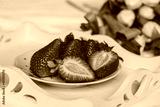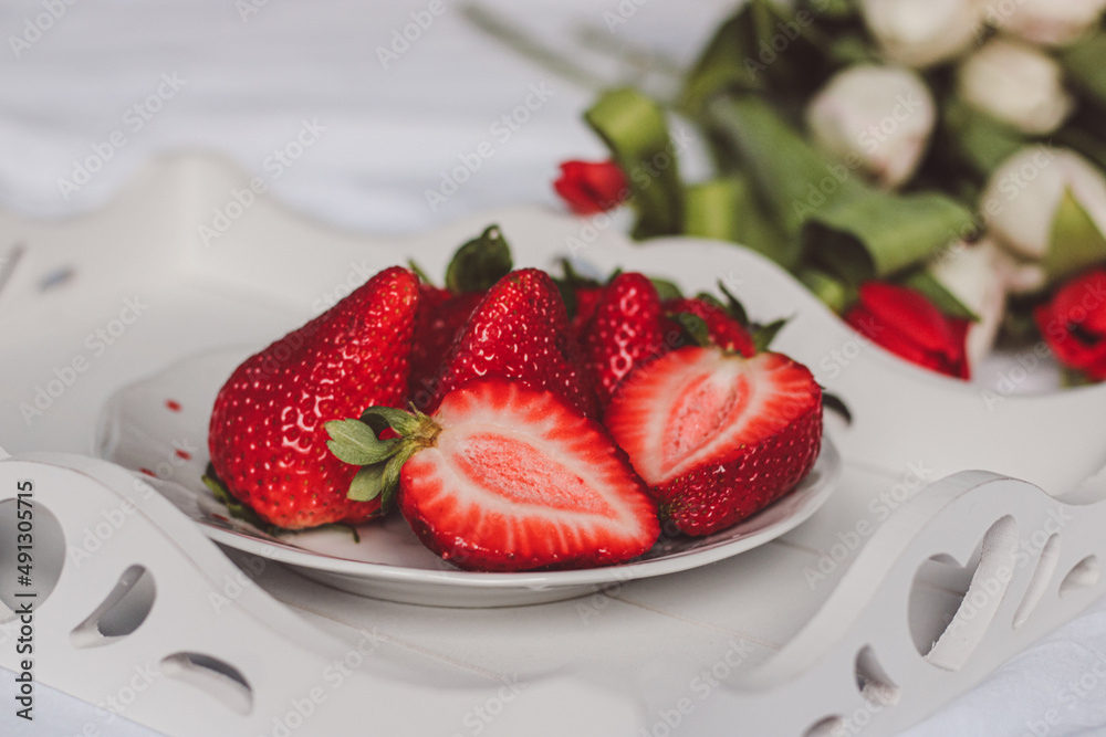 Ripe fresh red strawberries on a plate cut in half with white and red tulips in the background