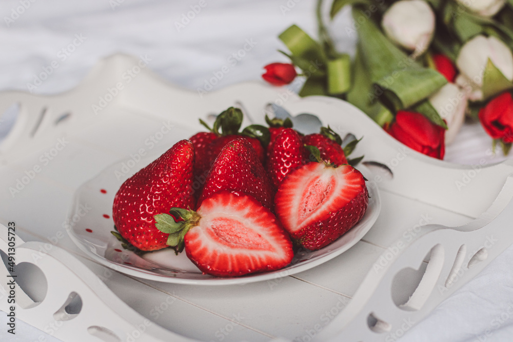 Ripe fresh red strawberries on a plate cut in half with white and red tulips in the background