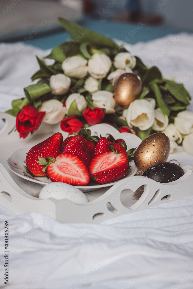 Sill life spring white and red tulips with ripe strawberries on a plate and easter eggs