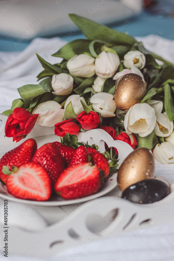 Sill life spring white and red tulips with ripe strawberries on a plate and easter eggs