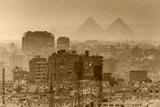 View of misty Cairo skyline with pyramids in the background, Egypt