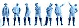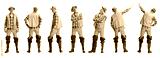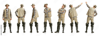 Profile, front and back view of man, fisherman standing alone isolated on white background. Concept of hobby, business, caree, job, sales, ad.