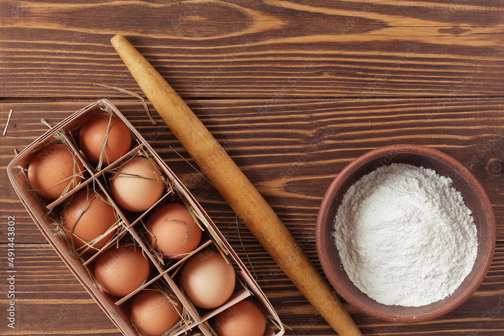 Ingredients for baking - flour, eggs, milk. With rolling pin and pouch. On wooden table