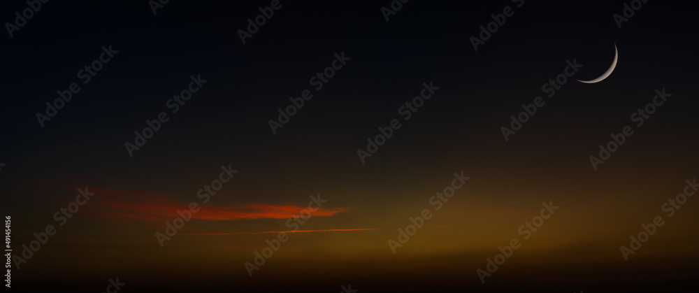 Crescent moon on dusk sky twilight in the evening symbol religion of Islamic well editing text Ramadan Kareem, Eid Al Fitr, Eid Mubarak, Eid Al Adha on free space background