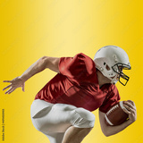 American football sportsman player with ball in action on gradient multicolored neon background, footballer in white helmet and red t-shirt ready to play.