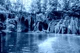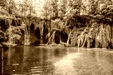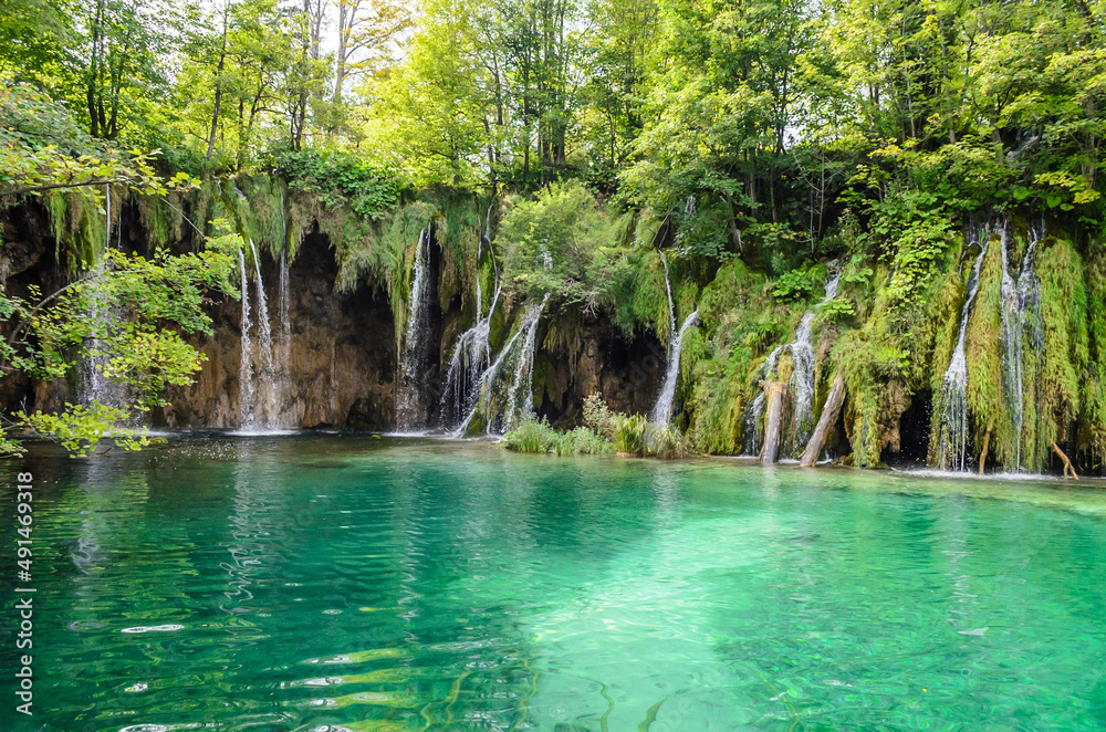 Big Waterfalls over the Turquoise Waters of the Lake in Plitvice National Park, Croatia. Natural Environment with Emerald Water, Green Trees and a Deep Forest.
