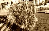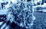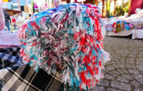 Colorful fringed or tasseled fabric pieces in woman producer bazaar, stack of folded bright cloth close up background. Side or profile view.