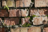 Old red brick wall with moss. Close-up. Brickwork. Weathered brick texture background for design.