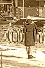 A woman in warm clothes is waiting for a traffic light permit sign on a sunny day