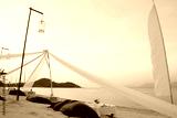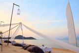 Outdoor restaurant lounge romantic dinner setting on tropical beach at sunset