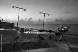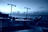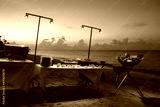 Outdoor restaurant on tropical beach with buffet and grill at sunset