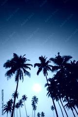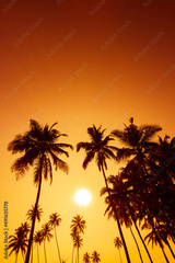 Tropical coconut palm trees silhouettes on beach at warm vivid sunset