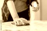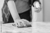 Cleaning hygiene, close up hand of young maid woman wearing protective gloves while cleaning on white marble table, use blue rag wiping to dust and spray in restaurant. Housekeeping cleanup, cleaner.