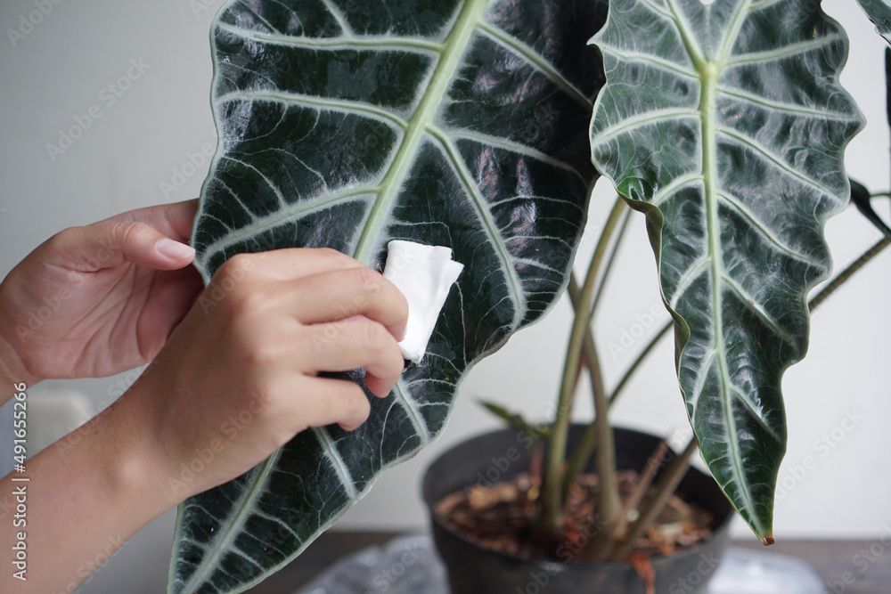 Female hands are wiping Alocasia leaves with moistened cotton.