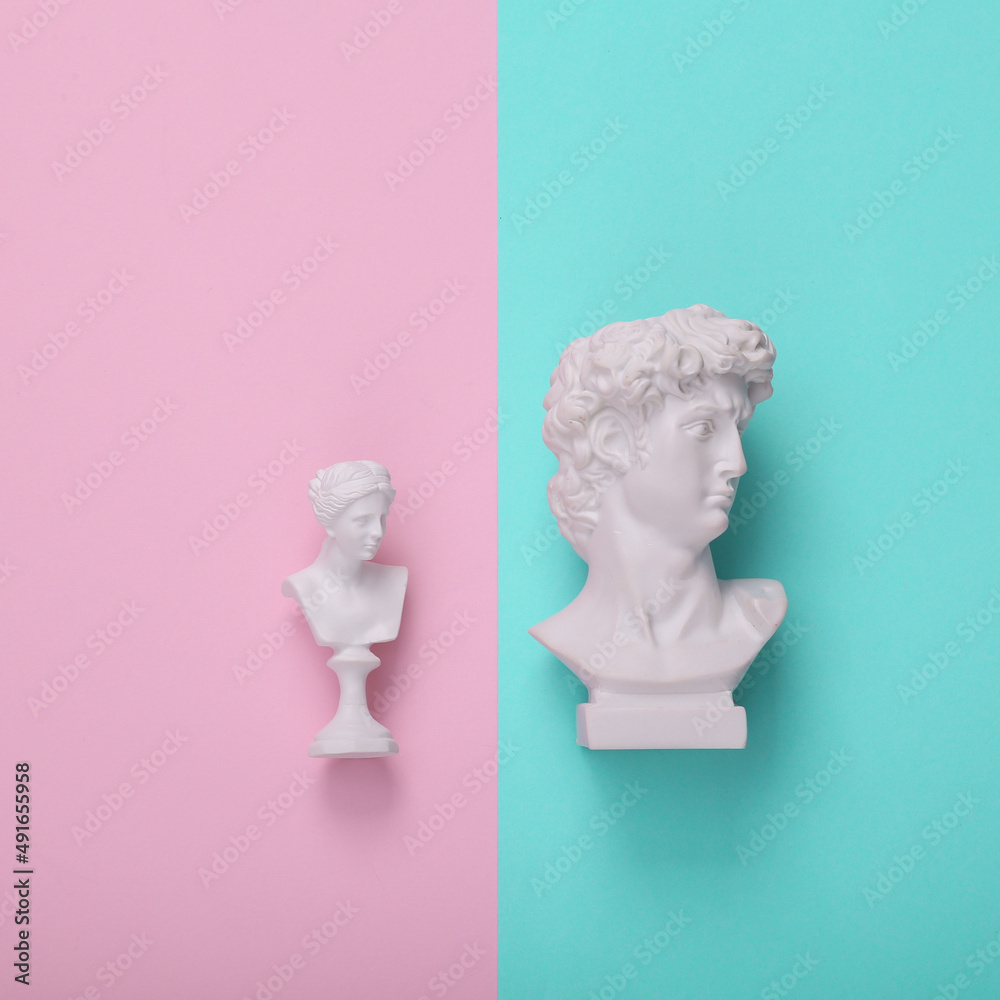 David and Venus busts on pink blue background. Creative layout. Minimal still life. Flat lay. Top view