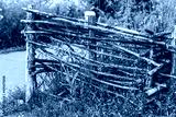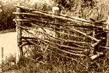 A fence made of woven branches to create an environmentally sustainable wall in the backyard garden. Background, texture, decor element