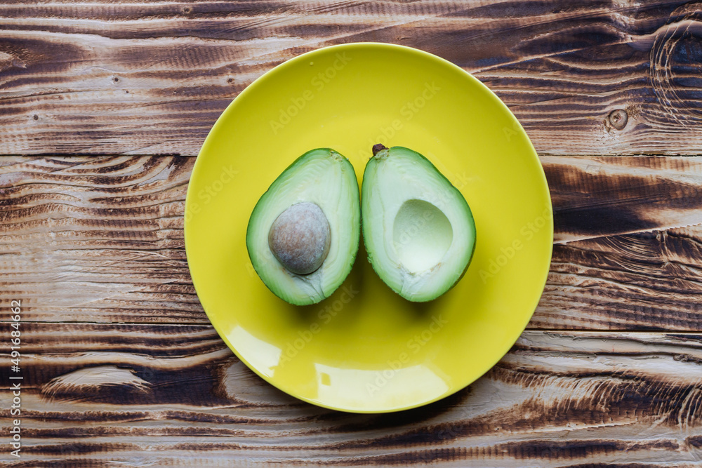 Avocado on a yellow plate, green avocado fruit cut in half, a large stone on a brown wooden table