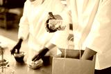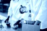 Cooks in protective gloves prepare take away food and packing them into paper bag for delivery, close-up on food. Concept of cooking food at dark kitchen for delivery