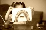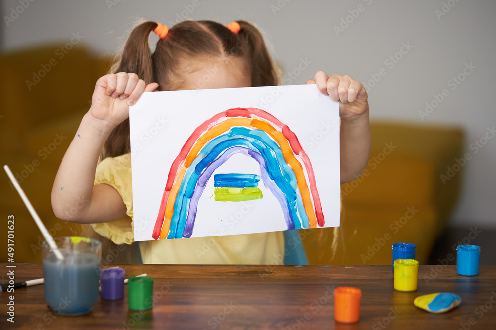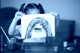 No war. Little sad girl draws a picture about Ukraine. Draws a rainbow and the Ukrainian flag