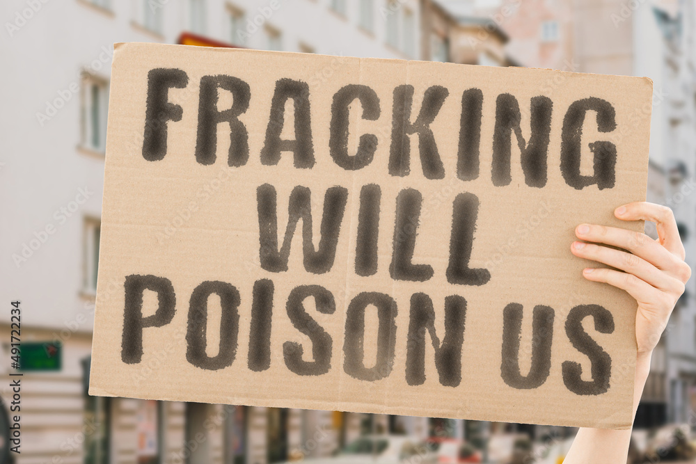 The phrase " Fracking will poison us " on a banner in men's hands with blurred background. Chemical. Cruel. Environmental. Protection. Uncertainty. Careless. Dirty. Dirt. Toxic. Fatal. Bad