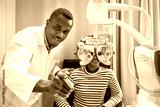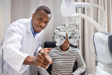 African young woman girl doing eye test checking examination with male man optometrist using phoropter in clinic or optical shop. Eyecare concept.