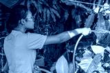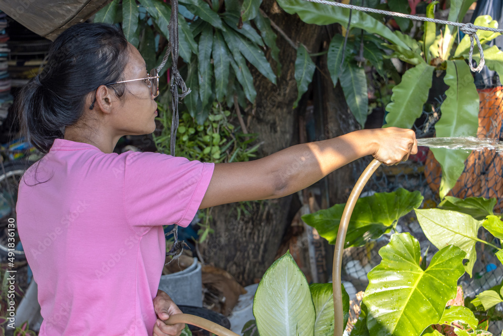 A young woman watering a tropical garden in the backyard of a house in Thailand.