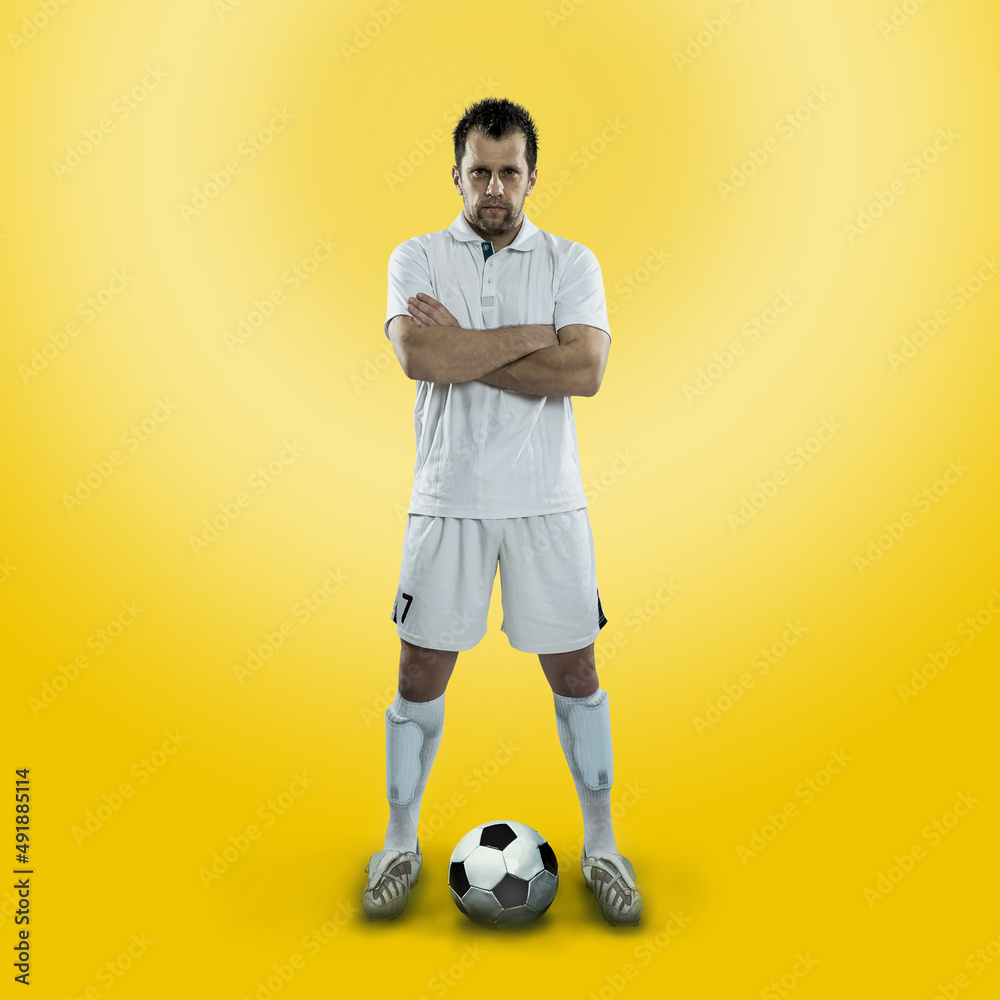 Professional soccer player hitting ball for winning goal in action on gradient multicolored neon background. Concept of sport competition.