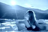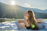 Portrait of young carefree happy smiling woman relaxing at hot tub during enjoying happy traveling moment vacation life against the background of green big mountains