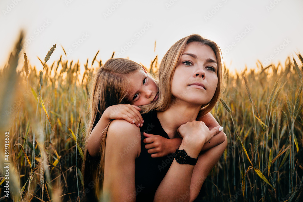 Cute child hugging her mother on a golden wheat field on summer sunset. Single-parent family