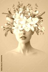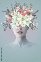 Abstract art collage of young woman with flowers