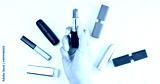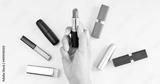 Woman holding the beautiful lipstick on her hand with cosmetic products and accessories on white background