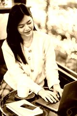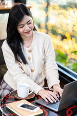 Portrait freelance business beautiful positive smile young asian woman online working with laptop computer and smartphone on notebook at home in the living room indoors or the cafe,Business Lifestyle