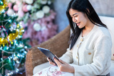Portrait freelance business beautiful positive smile young asian woman online working with using tablet at home in the living room indoors or the cafe,Business Lifestyle and rose background