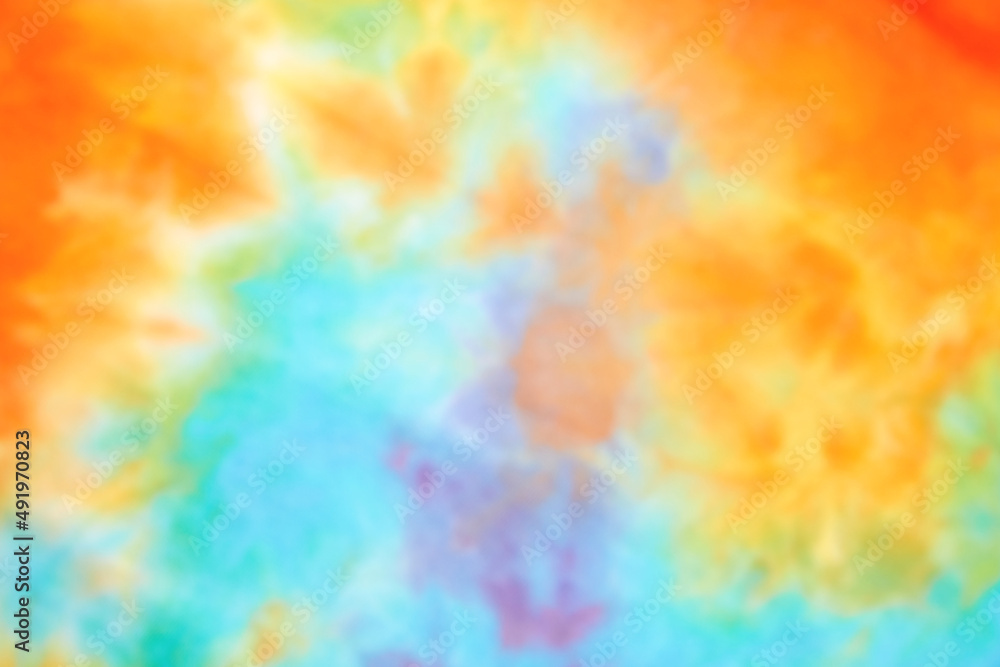 Blurred abstract tie dye multicolor fabric cloth pattern texture for background or groovy wedding card, sale flyer, 60s, 70s poster, kid tie-dye diy backdrop. Modern Watercolor Wet Brush Fabrics Art