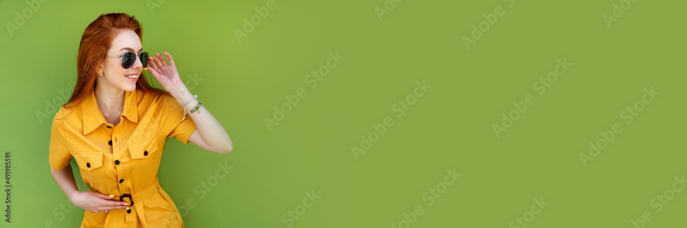 Portrait of young cheerful red-haired woman in a yellow shirt against green background