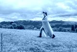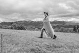 Woman in hat with plaid walks on grass on the top of mountain in camping activity in nature on autumn day, wild forest background.