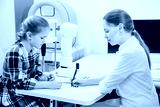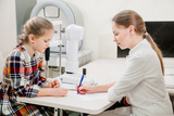 doctor interviews little girl before being examined in ophthalmologist's office.