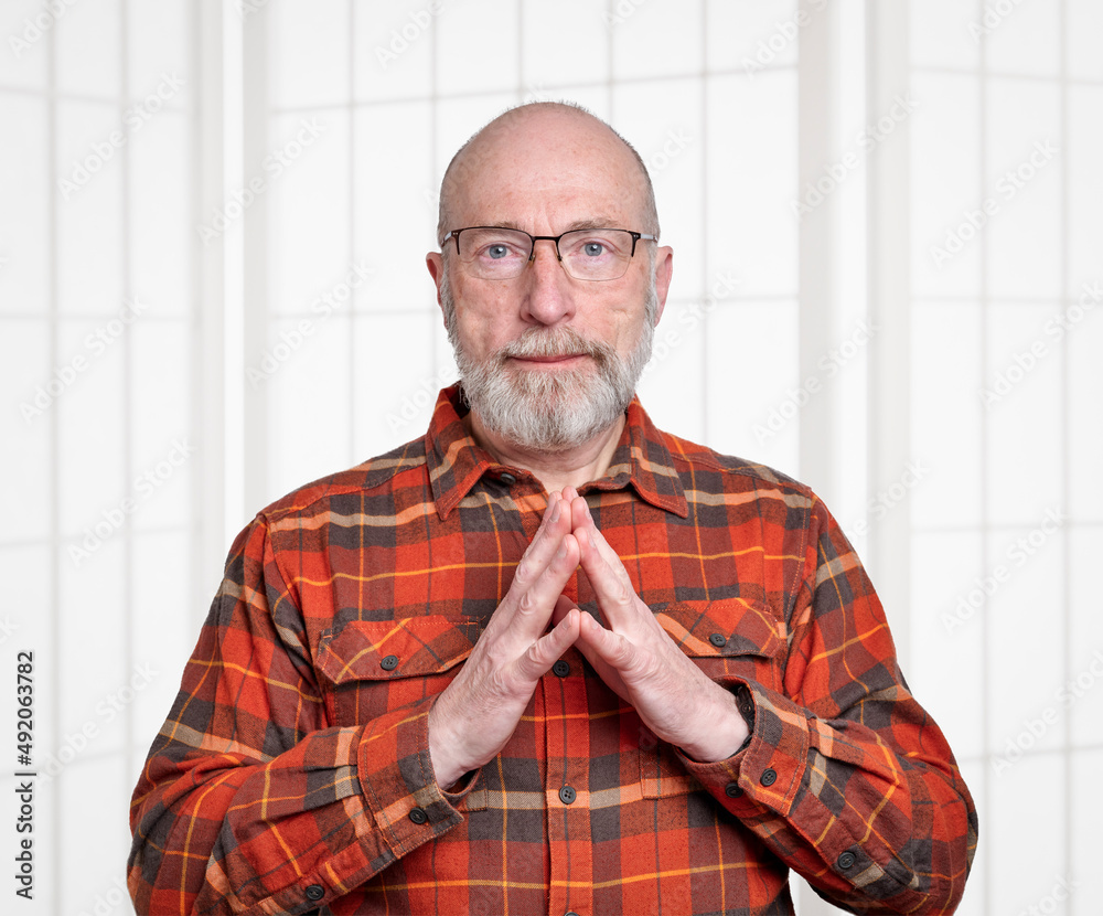casual, portrait of happy and confident senior man wearing glasses and a flannel shirt