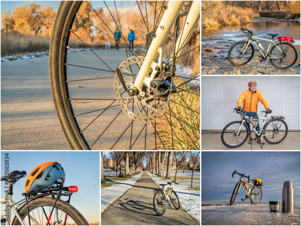 riding a touring or gravel bike on trails in Fort Collins area in Colorado, set of pictures featuring the same senior male cyclist, all images copyright by the photographer