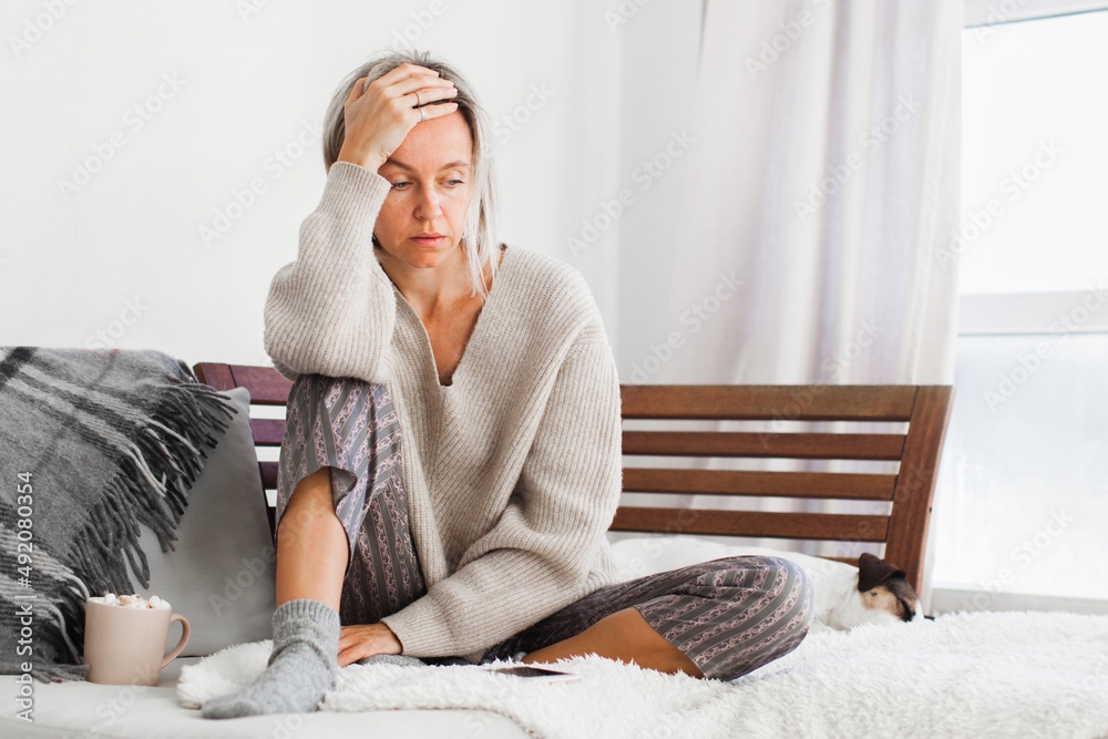 Depressed lonely unhappy mental woman sitting alone on the sofa feel stress