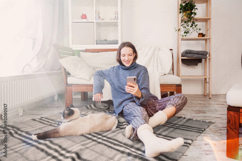 Girl sitting near sofa holding phone in her hands in an warm sweater on the floor