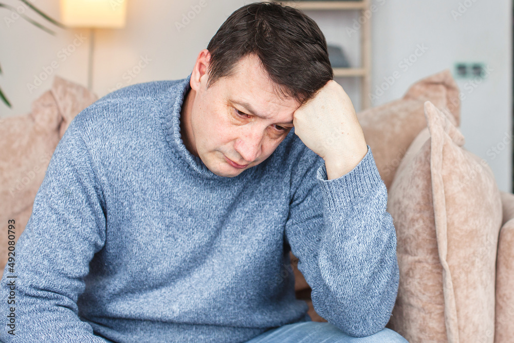 Unhappy middle-aged 50s man sit on couch