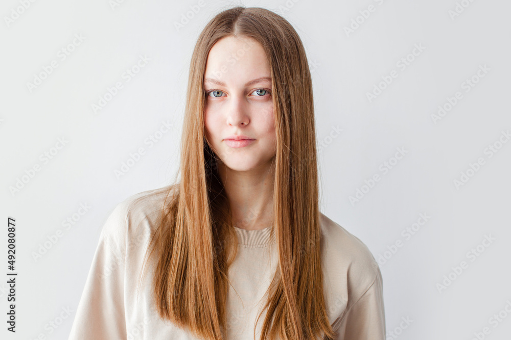 Portrait of young beautiful cute cheerful girl smiling over white background