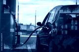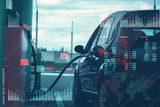 Gas station with fuel dispensers on technological background. Graph of rising prices for gasoline and fuel.