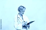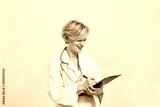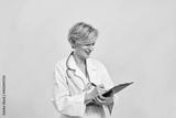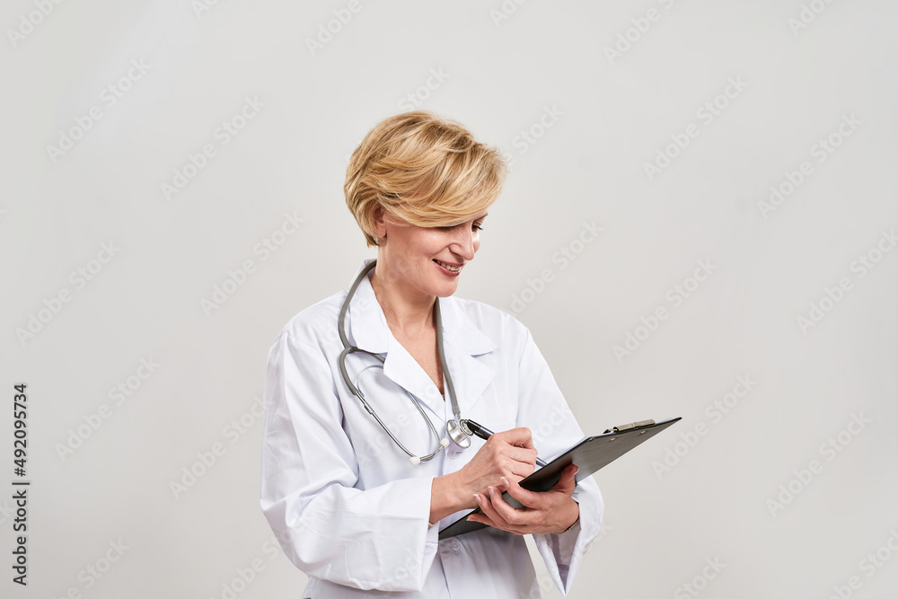 Smiling adult female doctor writing in clipboard