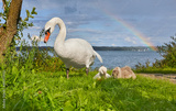 Fürsorgliche Schwanenfamilie an einem Bayrischen Seeufer mit schönem Regenbogen im Hintergrund. In Deutschland.